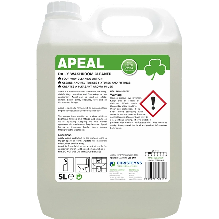 Daily Washroom Cleaner. A ready-to-use total toilet and washroom cleaner, which boasts a 4-in-1 cleaning operation: cleans, descales, deodorises and disinfects. Apeal incorporates a fresh Dewberry fragrance and a unique rinse additive, which reduces water spotting and enhances the appearance of washroom surfaces. Ideal to clean, deodorise, descale and disinfect toilets, urinals, baths, sinks, bidets, showers, tiles and all fixtures and fittings. Fast-acting Apeal is recommended as the sole product to clean bathrooms, washrooms, en-suites and changing rooms in the hotel and leisure industry.