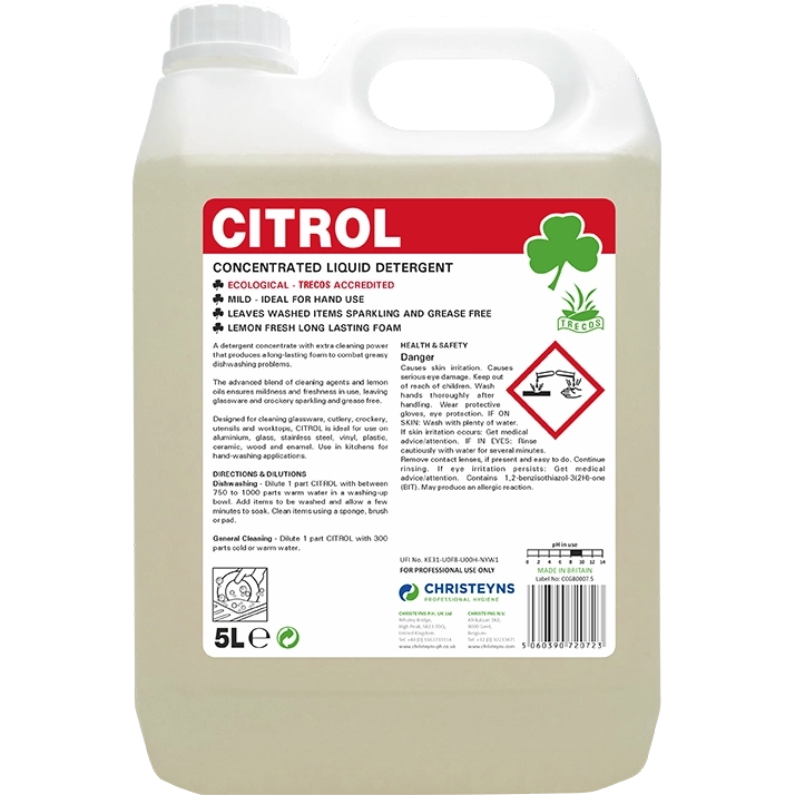 Lemon Washing Up Liquid.  A detergent concentrate with extra cleaning power that produces a long-lasting foam to combat greasy dishwashing problems. The advanced blend of cleaning agents and lemon oils ensures mildness and freshness in use, leaving glassware and crockery sparkling and grease free. Designed for cleaning glassware, cutlery, crockery, utensils and worktops, Citrol is ideal for use on aluminium, glass, stainless steel, vinyl, plastic, ceramic, wood and enamel. Use in kitchens for handwashing applications