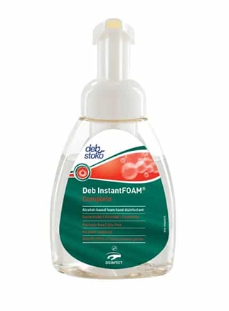 Highly effective, perfume-free, dye-free alcohol-based foam hand sanitiser with moisturiser. Use without water. Proven 99.999% efficacy against common germs in just 15 Seconds. The hypoallergenic foam formula is ideal for frequent use, leaving hands feeling refreshed, smooth and soft. Does not contain any gelling agents, so unlike ‘alcohol gel’ products, frequent use of Deb InstantFOAM does NOT leave hands feeling sticky. Also, the non-tainting and glove compatible formula is ideal for use in any food handling environment. The highly effective formula conforms to EN1500 in 30 seconds, prEN12054, EN1276, EN1275 EN1040.