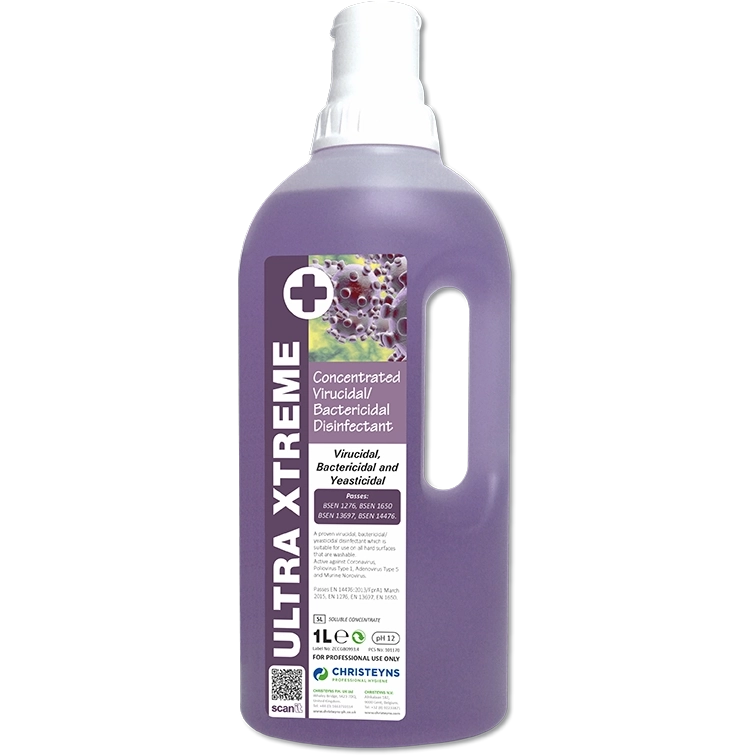 A proven virucidal, bactericidal/yeasticidal disinfectant which is suitable for use on all hard surfaces that are washable. Active against Coronavirus, Poliovirus Type 1, Adenovirus Type 5 and Murine Norovirus. Passes EN 14476:2013/FprA1 March 2015, EN 1276, EN 13697, EN 1650. Ideal for disinfecting all water resistant surfaces, such as; glass, aluminium, stainless steel, rubber, ceramic, plastic and tiled surfaces. General areas:Door handles, finger plates, communal equipment, tables, chairs, etc. Care homes:All touch surfaces that are washable. Kitchens:Work surfaces, fridges, chillers, microwaves, shelves, draining boards, sinks, etc. Food Industry:Conveyors, preparation surfaces, trolleys, shelves, equipment, etc. Bars/restaurants: Tables, counters, bars, etc. DIRECTIONSIf the area is dirty before disinfection clean first before carrying out the disinfection step. Dilute the product depending on the activity required and spray onto the surface. Allow 5 minutes contact time. After the contact time has been achieved, wipe away with a clean cloth or paper towel. For use in food contact situations rinse with clean water, for non-food contact areas wipe away with a clean cloth. DILUTIONSFor virucidal activity dilute 1 part Ultra Xtreme with 9 parts water and apply to the area. After 5 minutes wipe away with a clean cloth. For bactericidal/yeasticidal activity dilute the product 1: 15 with water and apply to the area. After 5 minutes wipe away with a clean cloth.