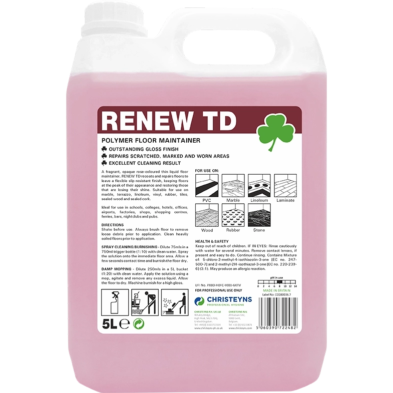 A fragrant, low viscosity, opaque, rose coloured liquid floor maintain Renew TD recoats and repairs floors to leave a flexible slip resistant finish, keeping floors at the peak of their appearance and restoring those that are losing their shine Suitable for use on marble, terrazzo, linoleum, vinyl, rubber, tiles, stone, sealed wood and sealed cork. Ideal for use in schools, colleges, hotels, offices, airports, factories, shops, shopping centres, ferries, bars, nightclubs and pubs.