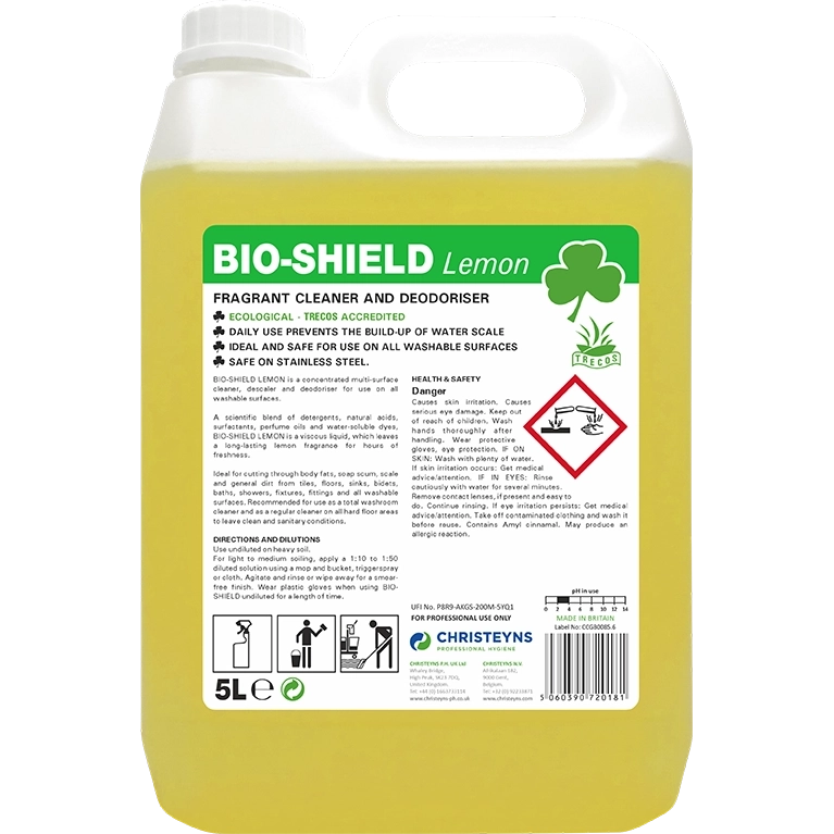 Bio Shield Lemon fragrant washroom cleaner is an acidic, concentrated cleaner and disinfectant recommended for regular use on hard floor areas and washable surfaces. It is a viscous blend of biocides, surfactants and perfume oils which freshen for hours after use.