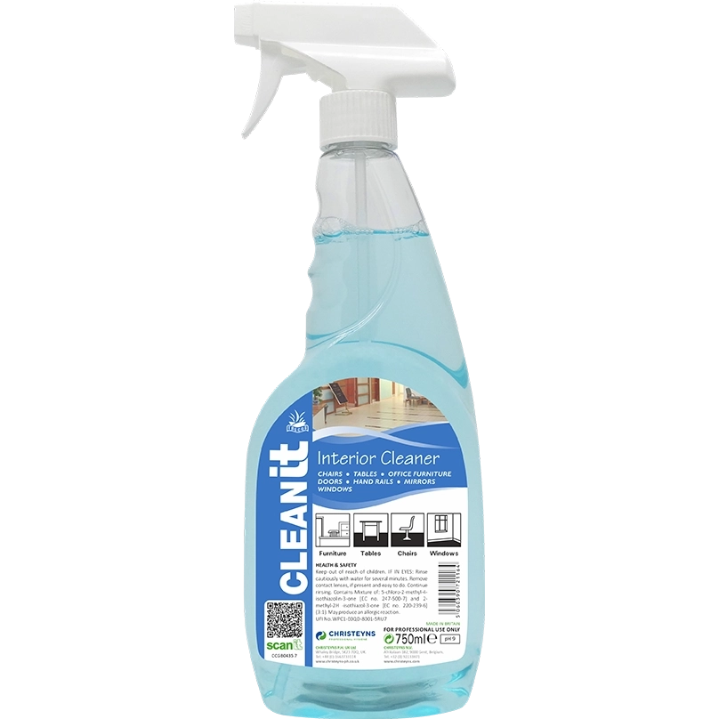 Interior Cleaner A surface-safe multi-surface cleaner, which cleans, freshens and enhances all hard surfaces without leaving a residue.A viscous, blue liquid with a fresh fragrance and a controlled foam level for easy application.Cleanit is ideal for the daily cleaning of general interior surfaces such as desks, chairs, windows, doors, etc.Suitable for use on wood, glass, plastic, aluminium, stainless steel and other water washable surfaces.