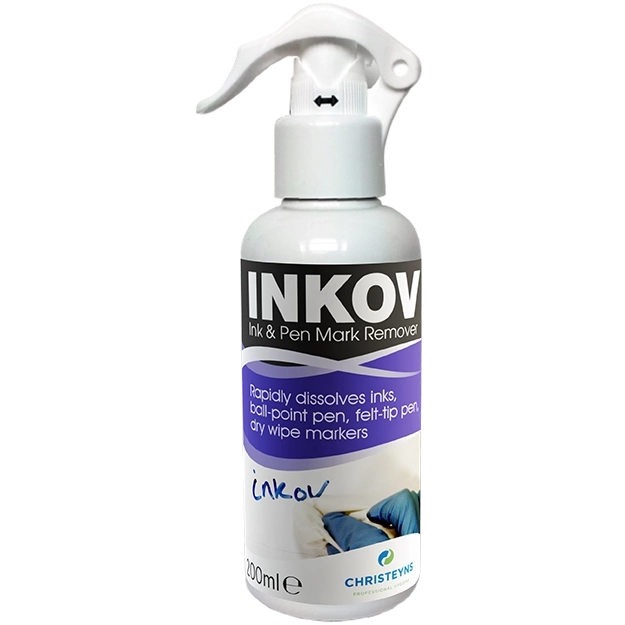 Inkov rapidly dissolves inks, ball-point pen, felt-tip pen and dry wipe markers from hard surfaces and solvent resistant fabrics.