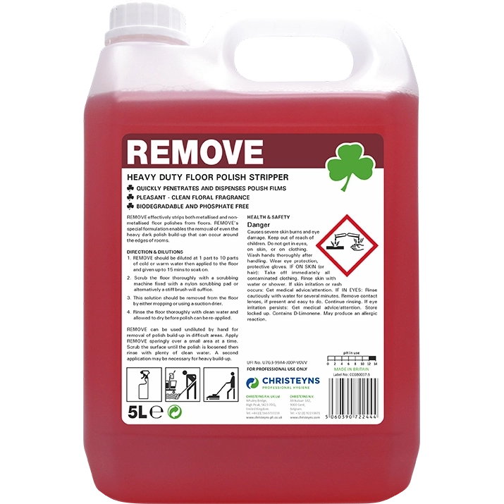 A traditional alkaline based floor stripper to remove even aged on polish film. A low odour liquid floor stripper that is free from harsh solvents and ammonia that produces a clean, receptive base for a new application of polish. Effective on both metallised and non-metallised floor polishes. Ideal to strip emulsion polish from linoleum, thermoplastic floors, rubber, sealed wood and terrazzo. Recommended for use in schools, colleges, hotels, offices, airports, factories, shops, shopping centres, ferries, bars, nightclubs and pubs.