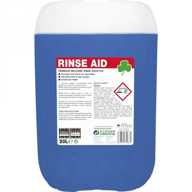 Premium Rinse Aid Additive. A rinse aid additive to prevent spots and hazing for a sparkling finish. A thin, clear blue liquid, Rinse Aid is a blend of specialist surfactants and mild acids in a taint-free aqueous base. Ideal to ensure a perfect finish on plates, crockery, cutlery, utensils, glassware, glasses and tumblers. Suitable for all automatic dish and glass washing machines in food and catering establishments; restaurants, bars, hotels, pubs and nightclubs.