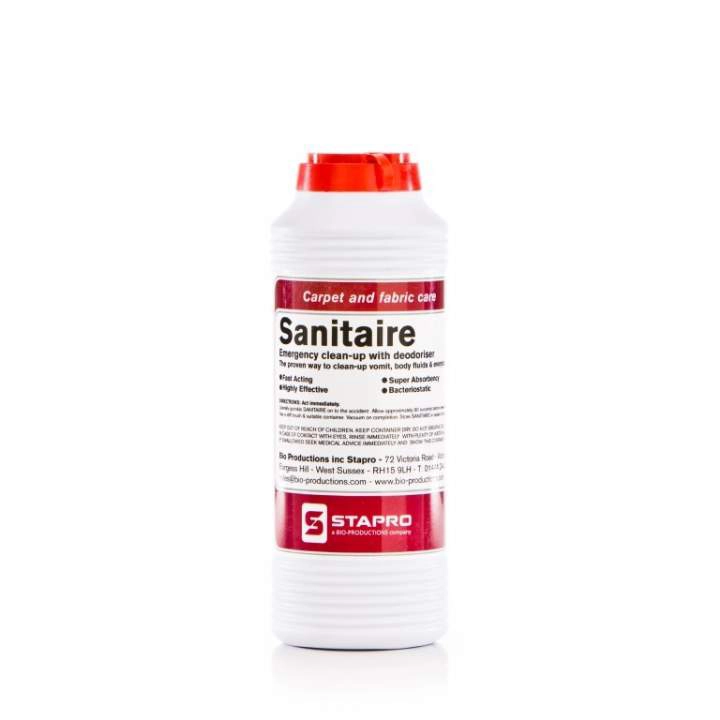 Sanitaire Emergency Clean-up Powder This absorbent powder is the market leading clean-up powder, with its subtle floral fragrance and germicidal action it has been specially formulated for use in all emergency situations where bodyspills occur. Sanitaire?s fast acting absorbent powder helps prevent the spread of airborne germs and odours while also helping to prevent soiling being absorbed deeper into upholstery fabrics and floor-coverings. Economical to use, Sanitaire is an effective emergency treatment for all accidental spillage?s including; vomit, urine, blood and faeces as well as for cleaning-up food and drink spillages. Sanitaire absorbs up to 400 times its own volume weight and is effective against gram positive and gram negative bacteria. Sanitaire is ideal for use in hospitals, care homes, clinics, institutions, doctors and veterinary surgeries, police stations, schools, hotels, restaurants, as well as in ambulances, taxis, coaches, ships and aircraft. Sanitaire offers the best solution to the most unpleasant task ? safely.